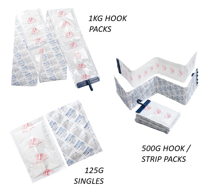 125g hook single container desiccant packs can be placed inside cartons or placed on the top of pallets, crates and other shipments. Each single pack has an peel-able adhesive back to affix the packs in suitable points in and around cartons and pallets.