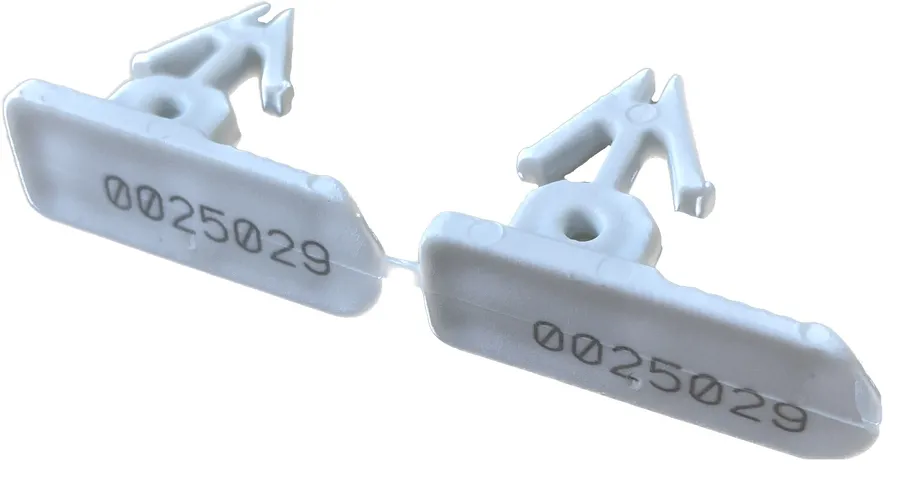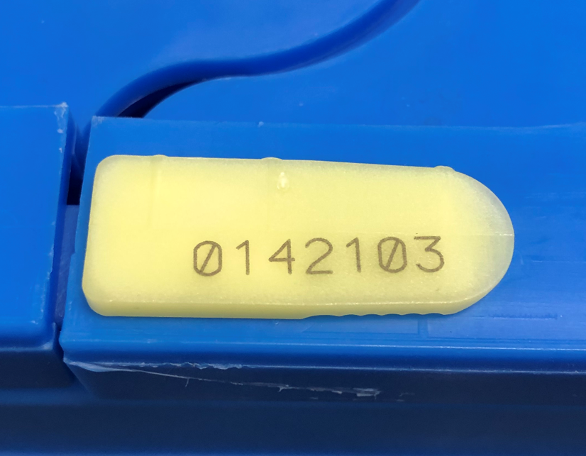 The seal is available in multiple configurations, colours and print options - including plain, numbered and customisation options. The large tab area enables highly visible printing of bespoke alpha-numeric numbering, text and logos to suit customer needs. In addition, a dual / joined version allows for printing of plug seals with duplicate numbering, allowing for the use of two seals with the same sequential number per tote box.