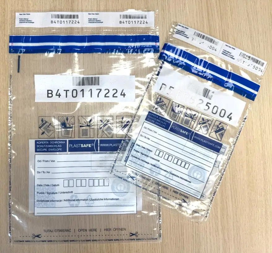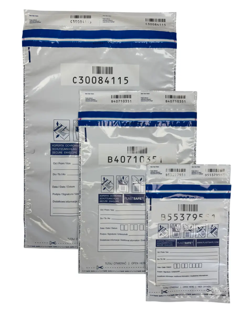 Each bag is equipped with an advanced security closure that reveals attempts at tampering via mechanical interference, extreme temperatures, or solvents.For traceability, every bag features unique numbering and Code 128 barcodes printed across the bag and its detachable receipts. Two tear-off receipts make it simple to maintain audit trails in banking, healthcare, and logistics applications. The treated white writing panels ensure any written details remain permanent and tamper-proof.